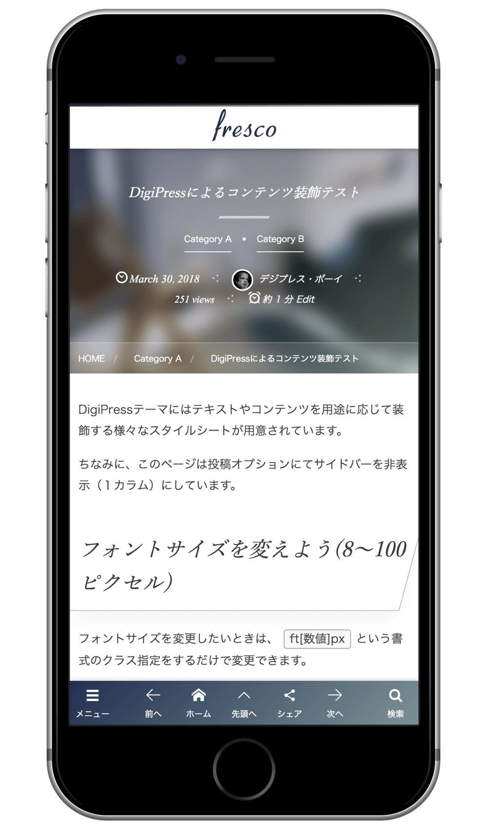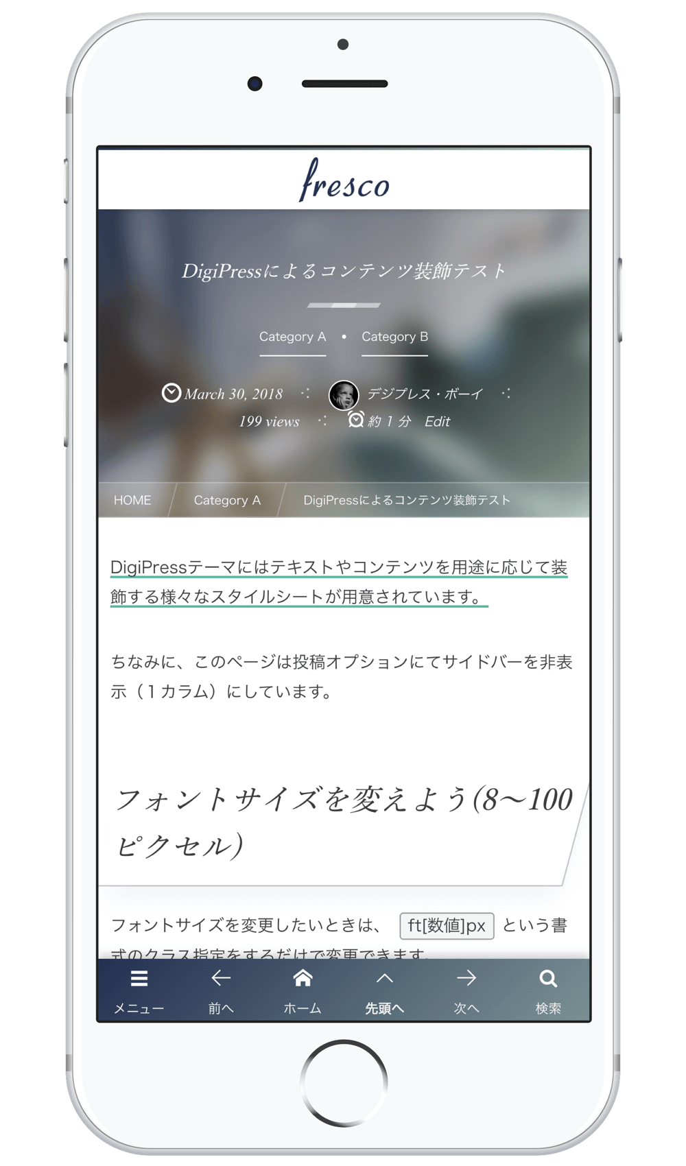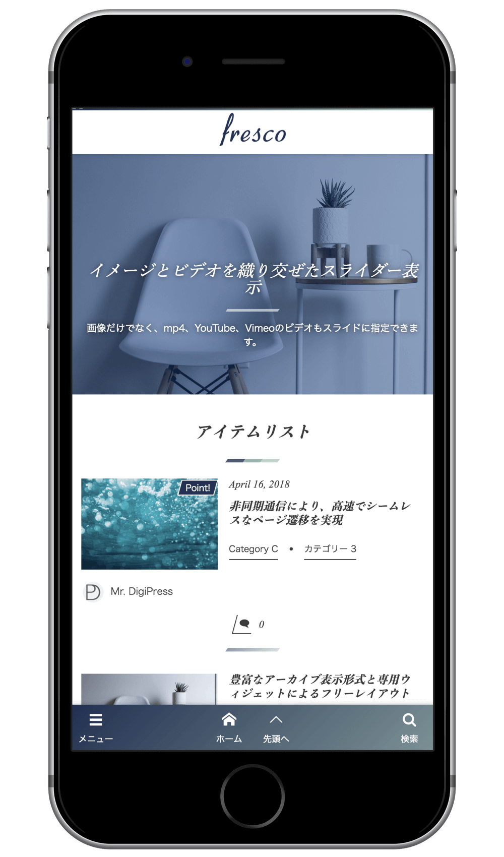 スマートフォンではモバイルに特化して無駄なコードや情報を省き、軽量化、最適化されたモバイル専用テーマにて表示します。