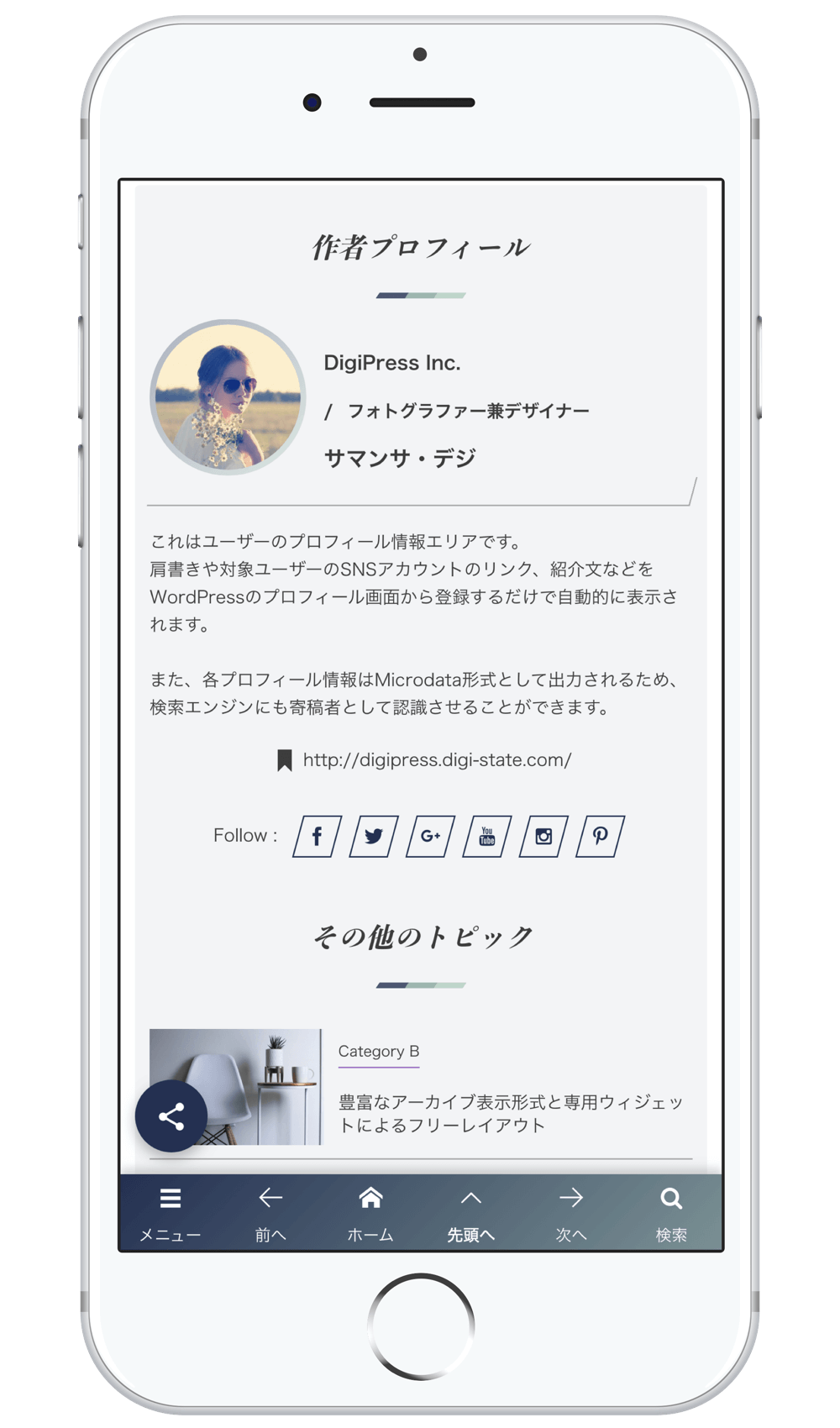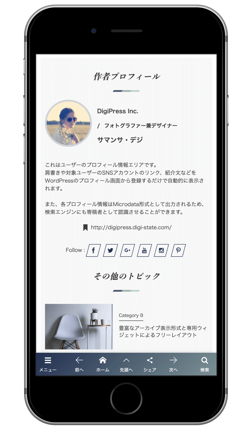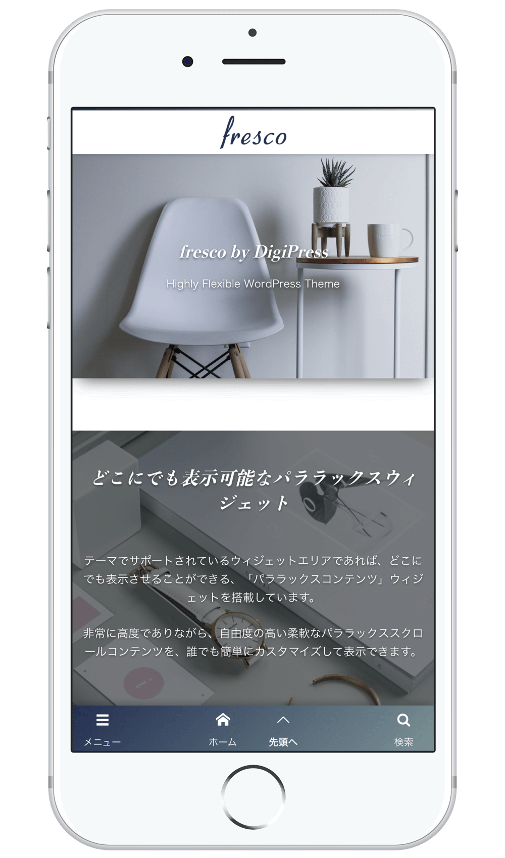 他の一般的なレスポンシブデザインにしか対応していないテーマと違い、PCからのアクセスとはテーマ自体が異なるため、単純なレスポンシブ表示では到底実現できない究極のモバイル要件にも対応しています。