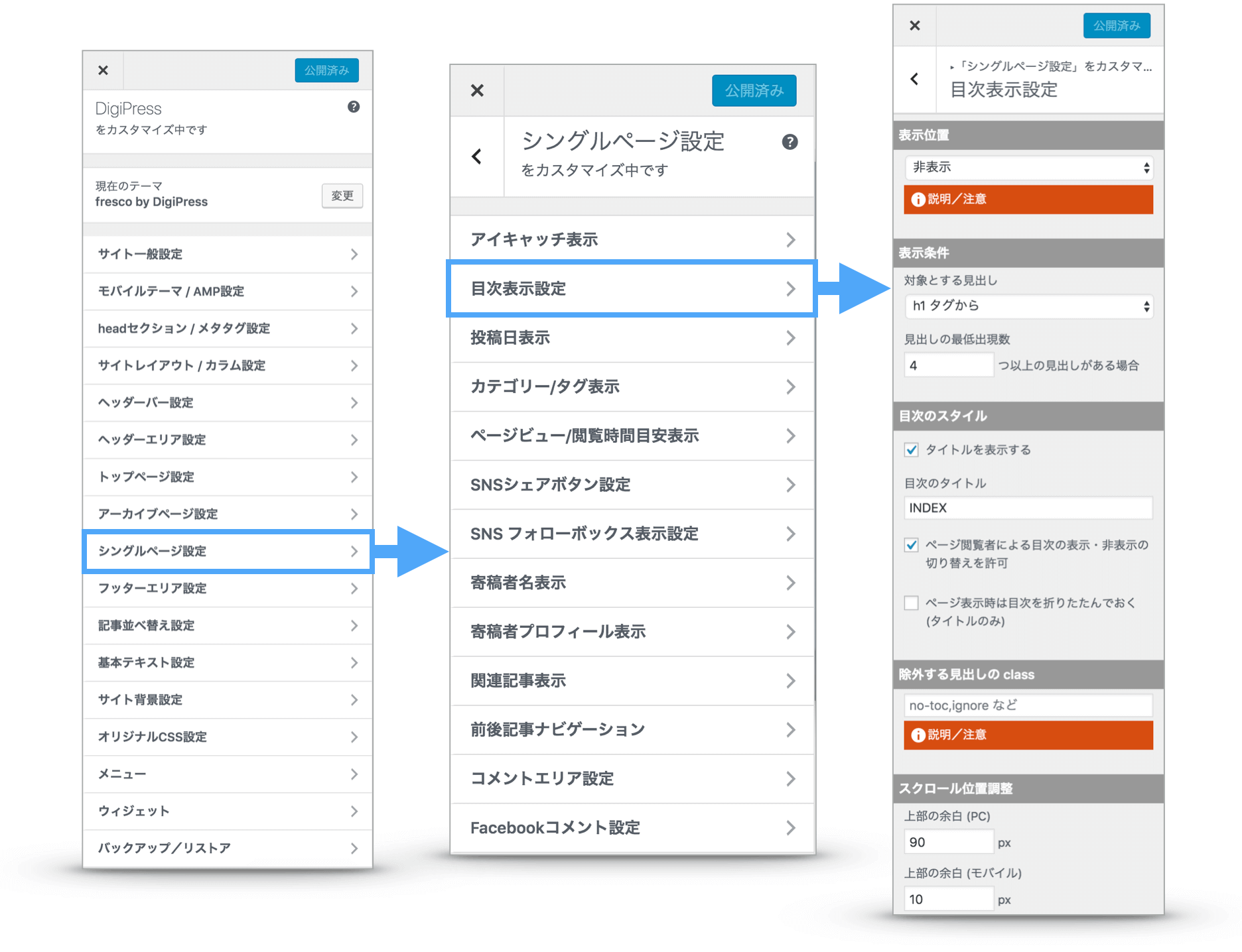 目次を表示する条件(見出しの最低出現数、見出しレベル、除外するclass)も柔軟に指定できます。